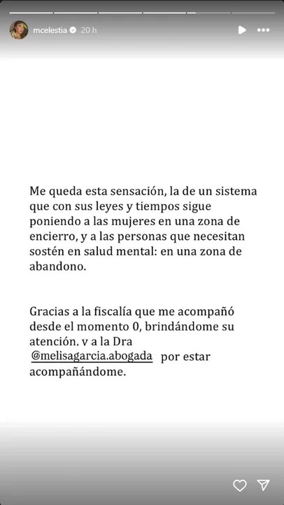 «Gracias a la cantidad de periodistas que se pusieron en contacto por este tema, no tengo mucho más para agregar por ahora, mi intención era visibilizar, no mediatizar. Seguirá el caso mi abogada @melisagarcía.abogada»