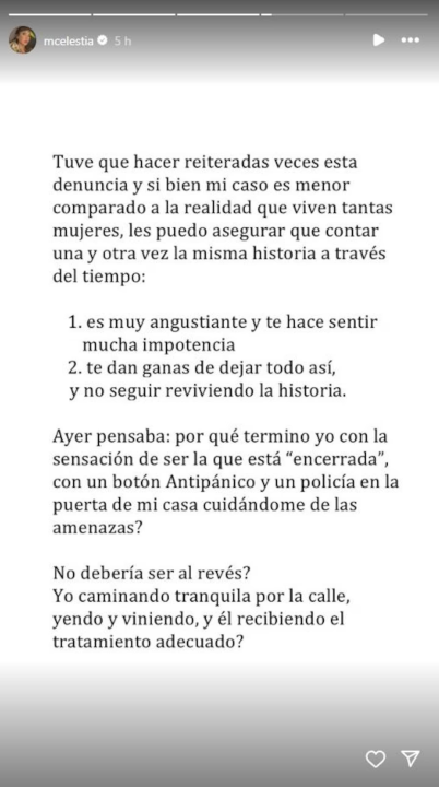 Celeste Cid contó que tuvo que hacer reiteradas veces esta denuncia. “Si bien mi caso es menor comparado a la realidad que viven tantas mujeres, les puedo asegurar que contar una y otra vez la misma historia a través del tiempo: es muy angustiante y te hace sentir mucha impotencia, y te dan ganas de dejar todo así, y no seguir reviviendo la historia”.