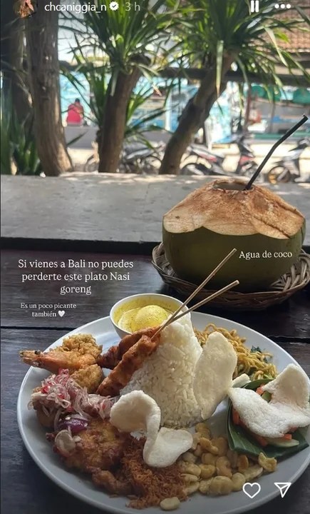 «Miren qué hermoso es el templo. Si vienes a Bali no puedes perderte este plato Nasi goreng, es un poco picante también», comentó al mostrar uno de los platos que probó en esas tierras, muy entusiasmada con esta experiencia espiritual que pudo concretar.