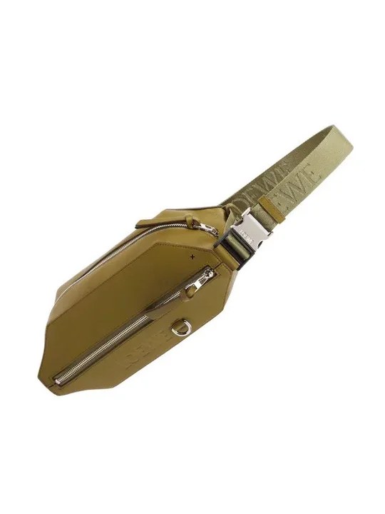 Uno de ellos es una riñonera convertible de Loewe, que cuenta con un diseño geométrico y está confeccionado con piel de becerro en tono verde oliva con una correa ajustable al hombro.
