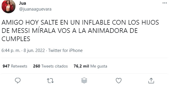 «AMIGO HOY SALTE EN UN INFLABLE CON LOS HIJOS DE MESSI MÍRALA VOS A LA ANIMADORA DE CUMPLES», publicó, en mayúsculas, demostrando su emoción por el momento.