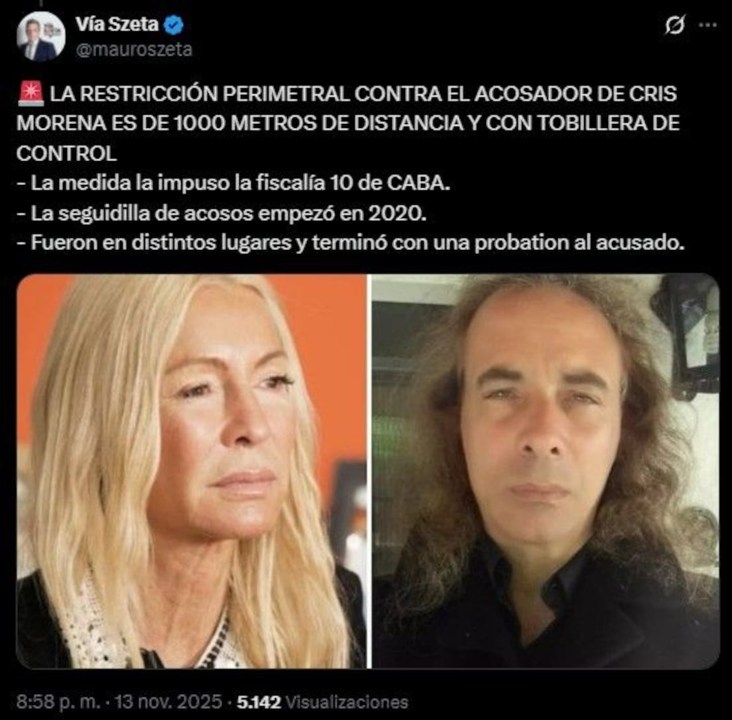 “La restricción perimetral contra el acosador de Cris Morena es de 1000 metros de distancia y con tobillera de control.”