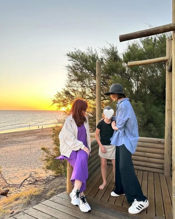 En las fotografías se puede apreciar a las tres generaciones disfrutando de un atardecer en la playa, con el característico cielo pintado por el Sol al descender sobre el horizonte marino.