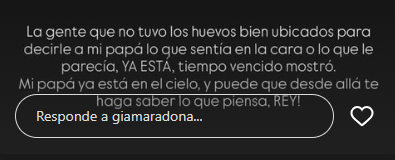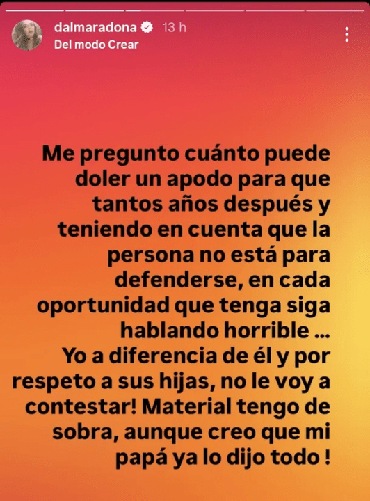 Las hijas del ídolo no tardaron en recoger el guante. La primera en reaccionar fue Dalma, quien cuestionó que Macri siga hablando del Diez cuando ya no puede defenderse. La actriz sostuvo que tiene “material de sobra” para responderle, pero aclaró que por respeto no lo hará. Además, agregó que le resulta llamativo que haya quienes critiquen ahora a su padre cuando no se animaban a decirle esas cosas en persona.