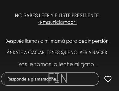 Más tarde, Gianinna bajó un poco el tono de sus palabras y pidió disculpas a los hijos de Macri por el exabrupto, aunque ratificó su postura. Finalmente, cerró su descargo con una reivindicación emotiva hacia Maradona, asegurando que el ídolo “ya está en el cielo” pero sigue presente en la memoria de su familia.