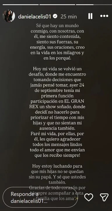 Daniela dejó sus obligaciones laborales de lado para estar junto a sus pequeñas hijas, Laia y Aimé: «Paré mi vida por ellas, por él. Les quiero agradecer todos los mensajes lindos, todo el amor que me envían, que los recibo siempre.. Hoy estoy luchando para que mis hijas no se queden sin su papá. Y sé que ustedes también. Gracias de todo corazón por siempre acompañar a esta familia que los ama».