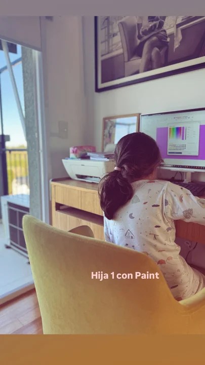 En la primera foto se puede ver a la hija menor de la pareja, Emilia, de cinco años, en pijama, mientras se entretiene al dibujar en la computadora. Sobre la imagen, Barassi agregó: “Hija uno con paint”.