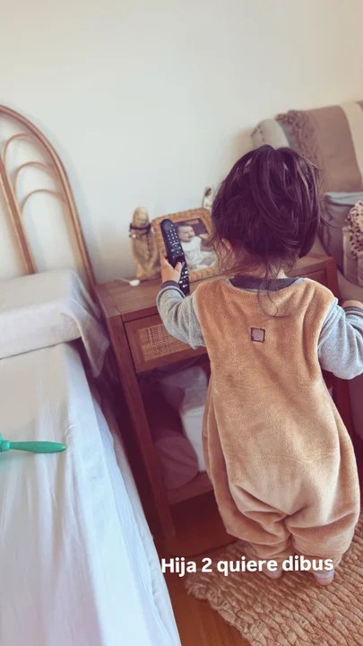 A continuación, el conductor agregó una postal de Inés. En la imagen, la pequeña de sólo dos años está parada con un enterito afelpado, color camel, mientras toma el control remoto. En el texto, el actor escribió: “Hija dos, quiere dibus”.