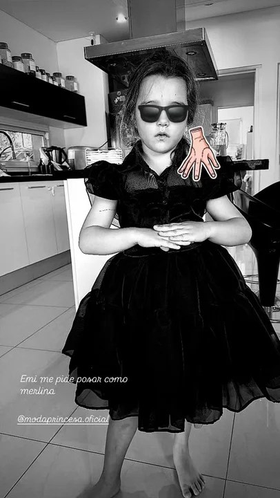 Más tarde, Emilia jugó a ser modelo y su papá le tomó fotos con un amplio vestido negro confeccionado a medida: “Emi me pide posar como Merlina -Adams-”, acotó además de una mano que hace referencia a “Dedos”, el personaje de la reconocida serie “Merlina”.