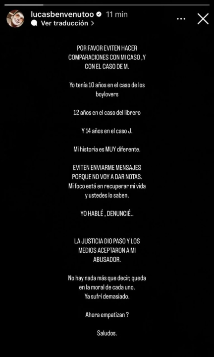 «Por favor, eviten hacer comparaciones con mi caso, y con el caso de M. Yo tenía 10 años en el caso de los boylovers, 12 años en el caso del librero y 14 años en el caso J. Mi historia es MUY diferente», dijo en su cuenta de Instagram Lucas Benvenuto, en clara referencia a las acusaciones que enfrenta Marley, el conductor de Telefe.