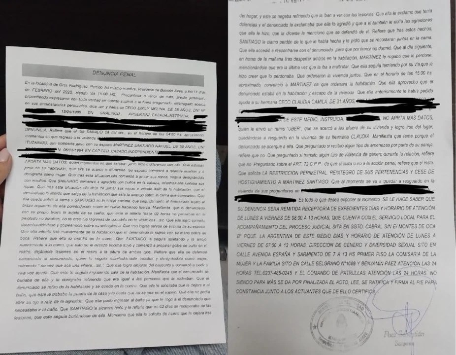 Emily reveló que su pareja intentó perdirle disculpas por las lesiones y que ella, por miedo a su reacción, las acepto: “Refiere que tras estos hechos, Santiago le clamo perdón de lo que había hecho y le pidió que se recostaran juntos en la cama. Que ella accedió a recostarse con el denunciado pero por el temor no durmió. Que al día siguiente, en horas de las mañana tras despertar ambos en la habitación, Martínez le rogaba que lo perdone”.