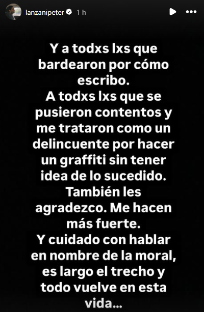 Sin embargo, no todo fueron mensajes de aliento. Peter también aprovechó para enviar un contundente mensaje a quienes lo criticaron tras el incidente: “Me hacen más fuerte. Cuidado con hablar en nombre de la moral, es largo el trecho y todo vuelve en esta vida”. Con estas palabras, el protagonista de Argentina 1985 dejó en claro que las adversidades no lo doblegan y apuntó contra aquellos que lo “bardearon” en medio de la situación.