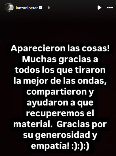 “Aparecieron las cosas. Muchas gracias a todos los que tiraron la mejor de las ondas, compartieron y ayudaron a que recuperemos el material. Gracias por su generosidad y su empatía”, escribió Lanzani, agradecido por el desenlace positivo. El robo, que había ocurrido días atrás, involucró una mochila con discos rígidos que contenían valioso material de trabajo, lo que generó gran preocupación en el actor.