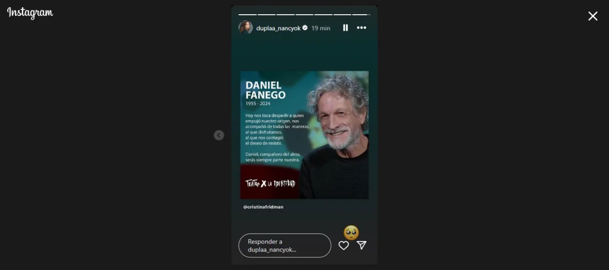 Tuve el enorme honor de compartir con el querido Daniel Fanego su talento y su compromiso con nuestra profesión y nuestros compañeros. Teatro por la identidad nos volvió a juntar en nuestro compromiso con los derechos humanos. Que la tierra te sea leve querido Daniel.