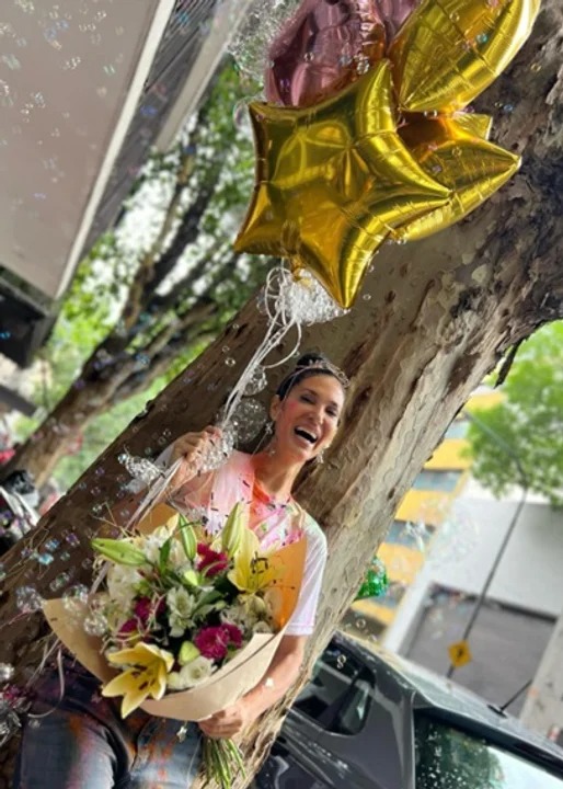 La artista coronó el logro con una celebración a la altura de su estilo explosivo. No eligió un festejo íntimo, sino una verdadera fiesta estudiantil al aire libre. En las imágenes compartidas se la ve cubierta de espuma, pintura y serpentinas, con una enorme sonrisa mientras sostiene bengalas de colores. Usó una remera blanca atada, jean corto, botas negras, una tiara y un marco decorado con la frase “Ya soy locutora”, que selló un día inolvidable.