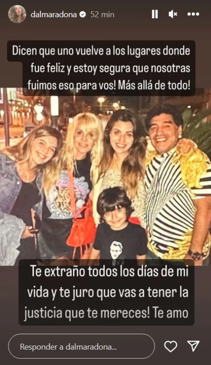 ¡Dicen que uno vuelve a los lugares donde fue feliz y estoy segura que eso fuimos para vos! ¡Más allá de todo!”, escribió Dalma Maradona en Instagram Stories junto a una foto retro en la que se la ve posando feliz junto a su padre; su hermana, Gianinna (con un pequeño Benjamín Agüero, fruto de su relación con Sergio “el Kun” Agüero) y su mamá, Claudia Villafañe.