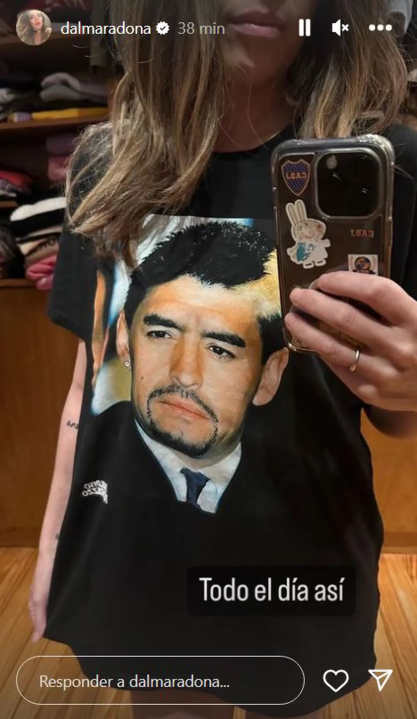 ¡Te extraño todos los días de mi vida!”, agregó, dejando en claro lo presente que tiene a su padre en su día a día. Además, en otra publicación, se mostró con una remera de Diego enorme: “Así todo el día”, escribió.