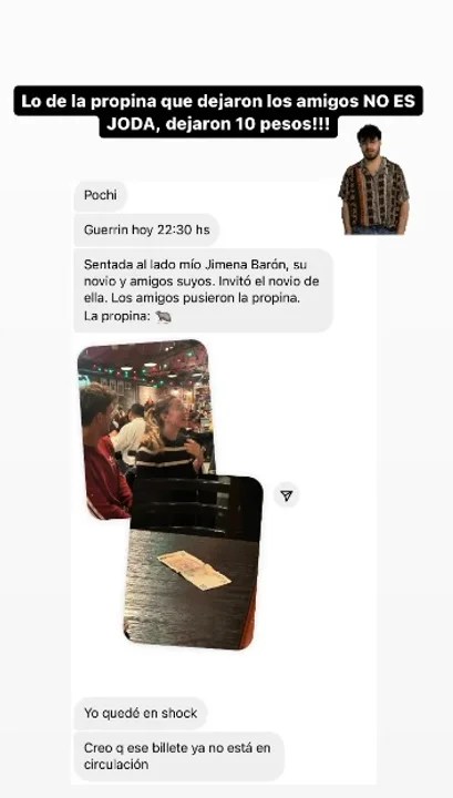 “Pochi” -como se la conoce en redes- agregó el texto: “Jimena Barón, Matías Palleiro y amigos, invitó él y los amigos pusieron la propina”.