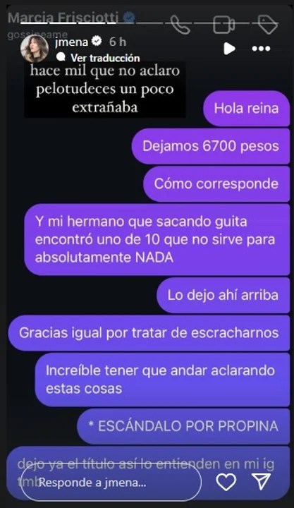 En cuanto Jimena Barón descubrió las historias, no dudó en responder. “La Cobra” apuntó: “Hola reina. Dejamos $6700 como corresponde. Mi hermano sacando guita encontró uno de ($)10 que no sirve para absolutamente nada”.
