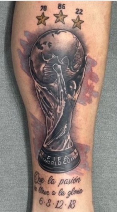Además al tatuaje le agregó algunos detalles, como los años en los que la selección consiguió sus copas, escribió, debajo, «Que la pasión te lleve a la gloria» y le agregó los números 6, 8, 12 y 18, algo que llamó la atención.