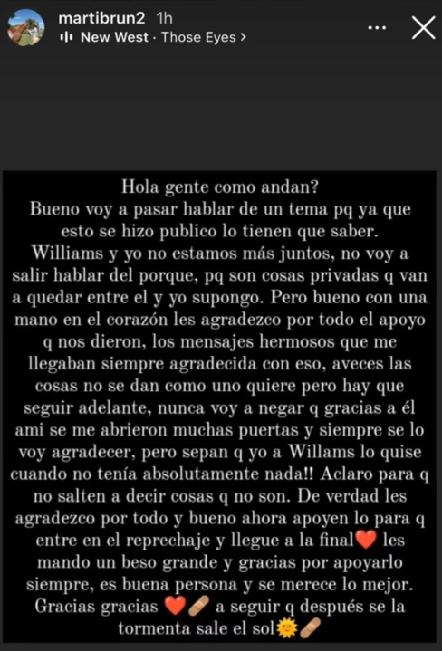 Ante esta situación los fanáticos del programa comenzaron a etiquetar a Martina Brun en vídeos donde se los veía a Catalina y Williams muy juntos. “Buen día, ¿cómo están? Quería decirles, con mucho respeto, que ya vi el video en TikTok de lo que le dijo Williams a Catalina. Por favor, dejen de comentarme y mandarme por privado porque no me hace bien. De verdad, muchas gracias” dijo la ex de «El Paisa» en su cuenta de Instagram. Poco menos de una hora después de haberla subido, la joven eliminó la historia.