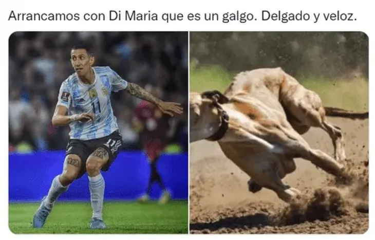 “Abro hilo de jugadores de Argentina como perritos. Arrancamos con Di María que es un galgo. Delgado y veloz”, inició y compartió la imagen del futbolista de la Juventus y un perro corriendo.