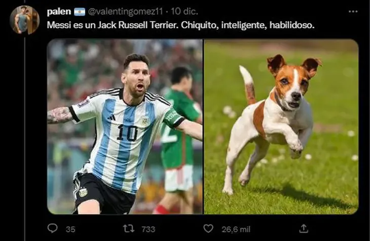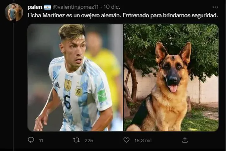 “El Papu es un Chihuaua. Chiquito, indescifrable y gracioso. Messi es un Jack Russell Terrier. Chiquito, inteligente, habilidoso. ‘Licha’ Martínez es un Ovejero Alemán. Entrenado para brindarnos seguridad”, agregó el tuitero.