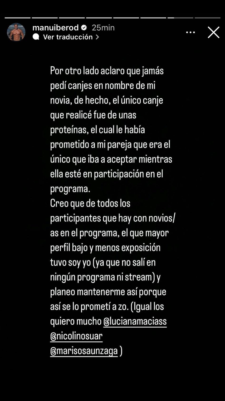 “Aclaro también que toda esta situación de odio y manipulación comenzó porque a esta persona no le gustaba que haga ‘lives’ en la plataforma de TikTok. Todos los que vieron esos vivos saben que siempre hablé bien de ella, la apoyé y jamás busqué nada por fuera de eso.» expresó Manuel.