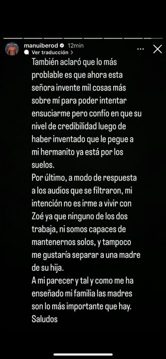 «Por último, a modo de respuesta a los audios que se filtraron, mi intención no es irme a vivir con Zoe ya que ninguno de los dos trabaja, ni somos capaces de mantenernos solos, y tampoco me gustaría separar a una madre de su hija. A mi parecer y tal y como me ha enseñado mi familia las madres son lo más importante que hay. Saludos” cierra Ibero, aclarando los últimos rumores.