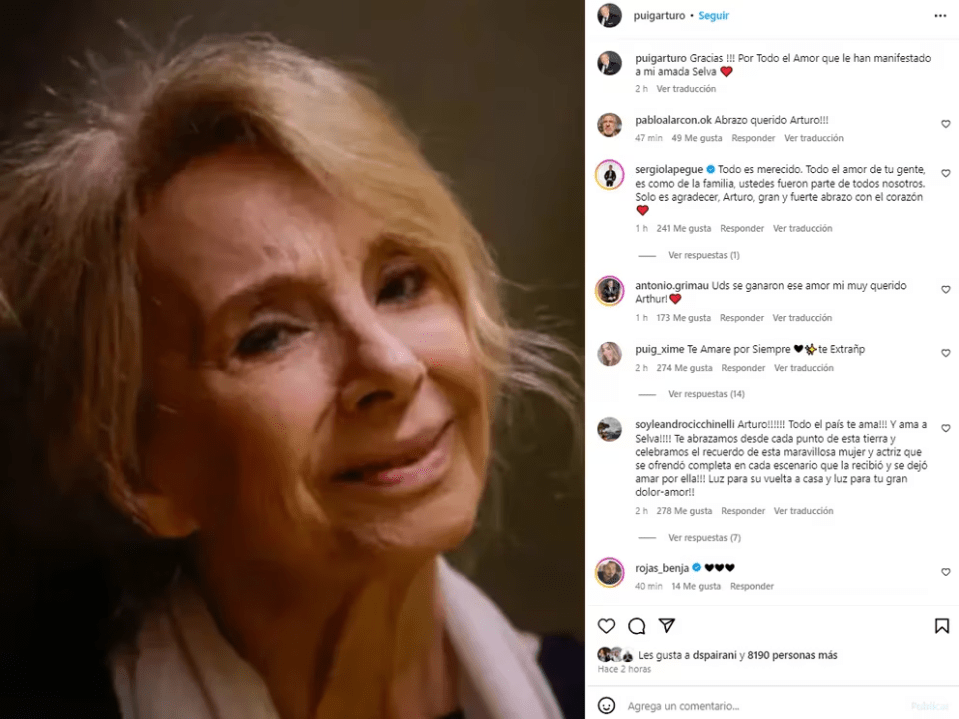 Después del velatorio y del posterior sepelio en donde cientos de personas se acercaron a despedir a Selva, este jueves por la tarde, Puig expresó sus sentimientos a través de un posteo en su cuenta de Instagram. “¡Gracias! por todo el amor que le han manifestado a mi amada Selva”, escribió el protagonista de Grande Pa, junto a una foto del amor de su vida y luego, sumó un emoji de un corazón rojo al final de la frase.