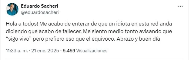 En su cuenta de Twitter, Sacheri escribió: «Hola a todos! Me acabo de enterar de que un idiota en esta red anda diciendo que acabo de fallecer. Me siento medio tonto avisando que “sigo vivo” pero prefiero eso que el equívoco. Abrazo y buen día».