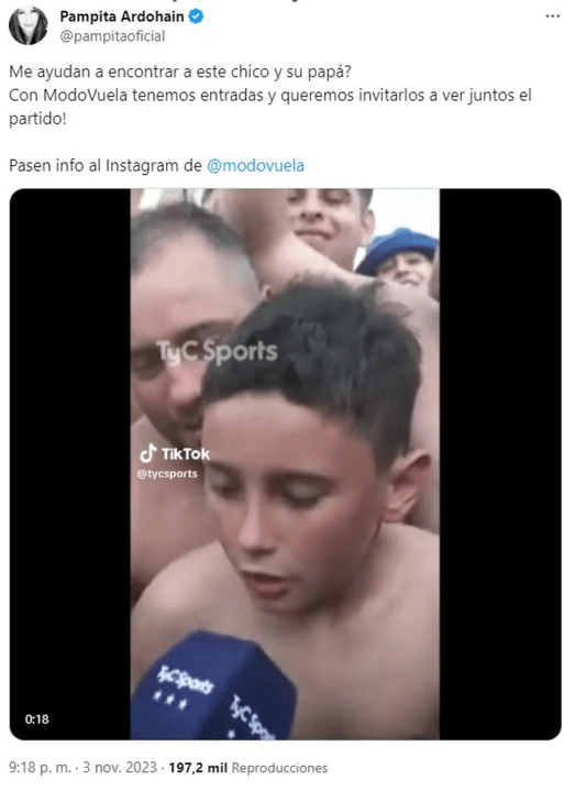 Carolina Pampita Ardohain fue una de la miles de personas que vieron el video del nene y, conmovida por las palabras, se dispuso a cumplirle el sueño de que pueda ver la final.