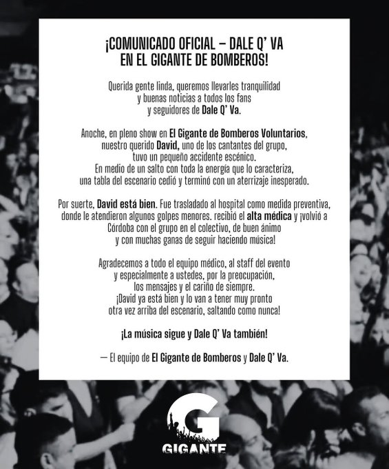 La banda Dale Q’ Va hizo su presentación en el escenario de Bomberos de San Francisco, en la provincia de Córdoba. Allí, el cantante David Ortiz sufrió una caída que alarmó al público presente y por la que tuvieron que suspender el show de este domingo.