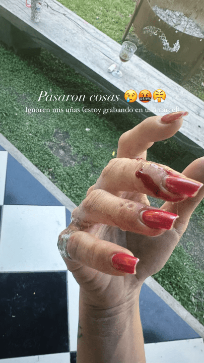 El accidente ocurrió en el jardín de la casa de la actriz, cuando intentó separar a su perra Sakura de un lagarto que vive en el lugar. “Pasaron cosas, ignoren mis uñas, estoy grabando en una cárcel”, escribió la modelo en sus stories junto a una imagen de su mano ensangrentada. Con su característico sentido del humor, la China se refirió a sus uñas, dado que se encontraba en pleno rodaje del spin-off de El Marginal, titulado Barro.