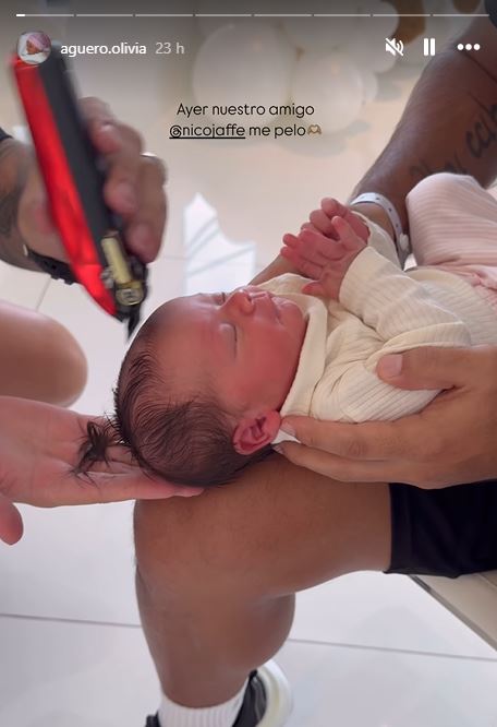 En la última historia se puede ver como “Kun” Agüero sostiene a su pequeña hija mientras el peluquero Nicolás Jaffe pasa la máquina de cortar el cabello en la pequeña. El estilista, además, trabajó con destacadas figuras como Lionel Messi y Bizarrap.