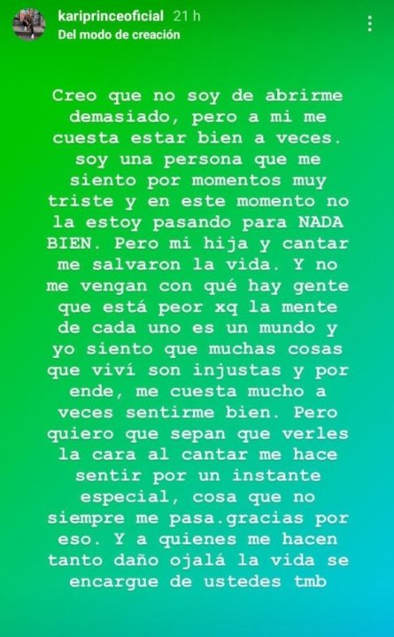 Sin embargo, reveló que se apoya mucho en sus seguidores. «Verles la cara al cantar me hace sentir especial por un instante, cosa que no siempre pasa; gracias por eso. Y a quienes me hacen tanto daño, ojalá que la vida se encargue de ustedes también«, concluyó.