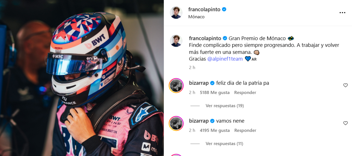 En su cuenta de Instagram, seguida por más de 4 millones de personas, el argentino compartió un mensaje optimista: “Finde complicado, pero siempre progresando. A trabajar y volver más fuerte en una semana”. Con la mirada puesta en el próximo Gran Premio en Barcelona, Colapinto se prepara para capitalizar su experiencia y seguir creciendo en la máxima categoría del automovilismo.