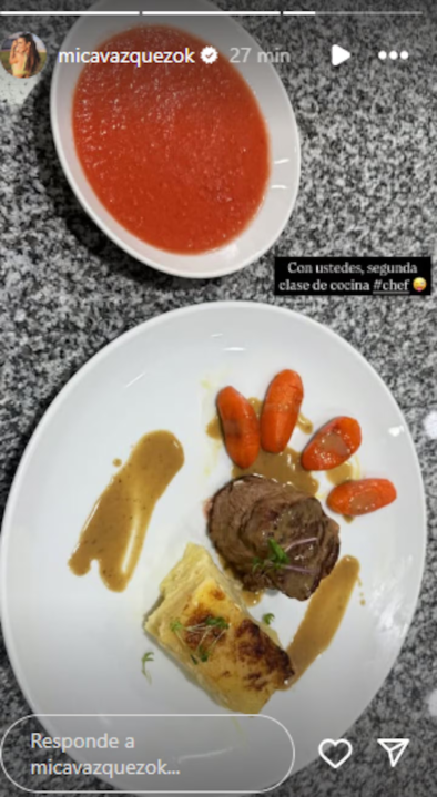 En la foto que posteó, Vázquez mostró un plato de lo que parece ser sopa de tomate y otro con carne, zanahorias baby y una masa de hojaldre. “Con ustedes, segunda clase de cocina. #Chef”, escribió en la imagen que no pasó desapercibida entre sus seguidores.