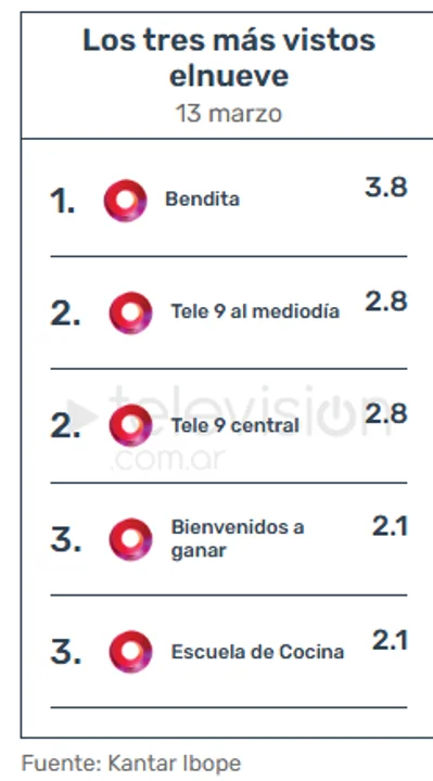 El podio del día lo completaron los informativos del ex canal de la palomita, Tele 9 al mediodía y Tele 9 Central, ambos con un promedio de 2.8.