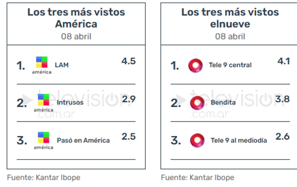 Por el lado de América no hubo tanta sorpresa ya que LAM volvió a ser lo más visto del día con 4.5. Lo más destacable, aunque negativo es que en podio no apareció Yanina Latorre con su SQP. Al ciclo de Ángel de Brito le siguió Intrusos con 2.9 y más atrás quedó Pasó en América con 2.4. El ciclo de Tartu y Sabrina Rojas se acerca a su final con las mediciones más altas de su corta historia, paradojas de la TV.
