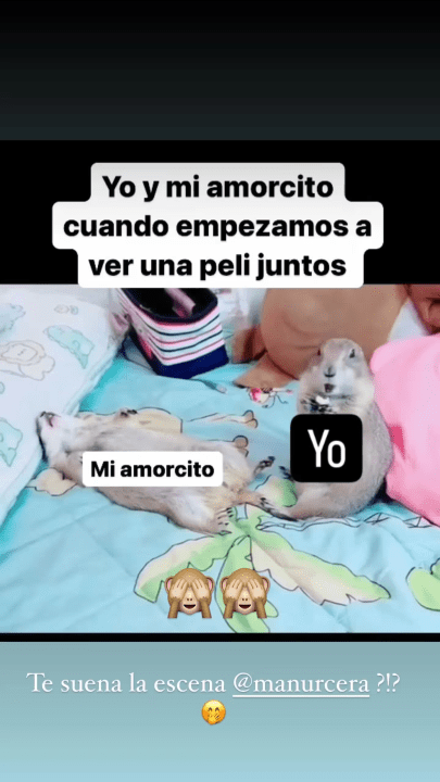 «Yo y mi amorcito (sic) cuando empezamos a ver una peli juntos«, escribió Nicole en una historia de Instagram. El texto fue acompañado por una imagen que muestra dos hámsters sobre una cama pero mientras uno parece estar sentado y muy activo, el otro se encuentra acostado y durmiendo boca arriba.