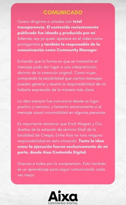 Tras la viralización del video, desde la empresa Shell Crespo, Erich Wagner y Cía S.R.L emitieron un comunicado disculpándose por el contenido difundido en la cuenta oficial de la estación de servicio.