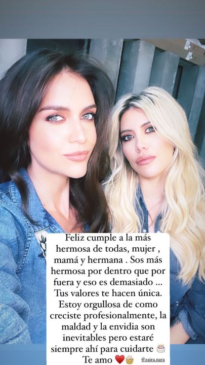 Wanda Nara le dedicó un tierno a Zaira Nara en redes sociales. La modelo cumple hoy 35 años. «Feliz cumple a la más hermosa de todas, mujer, mamá y hermana«, escribió Wanda Nara junto a una fotografía de ambas en una historia de Instagram.