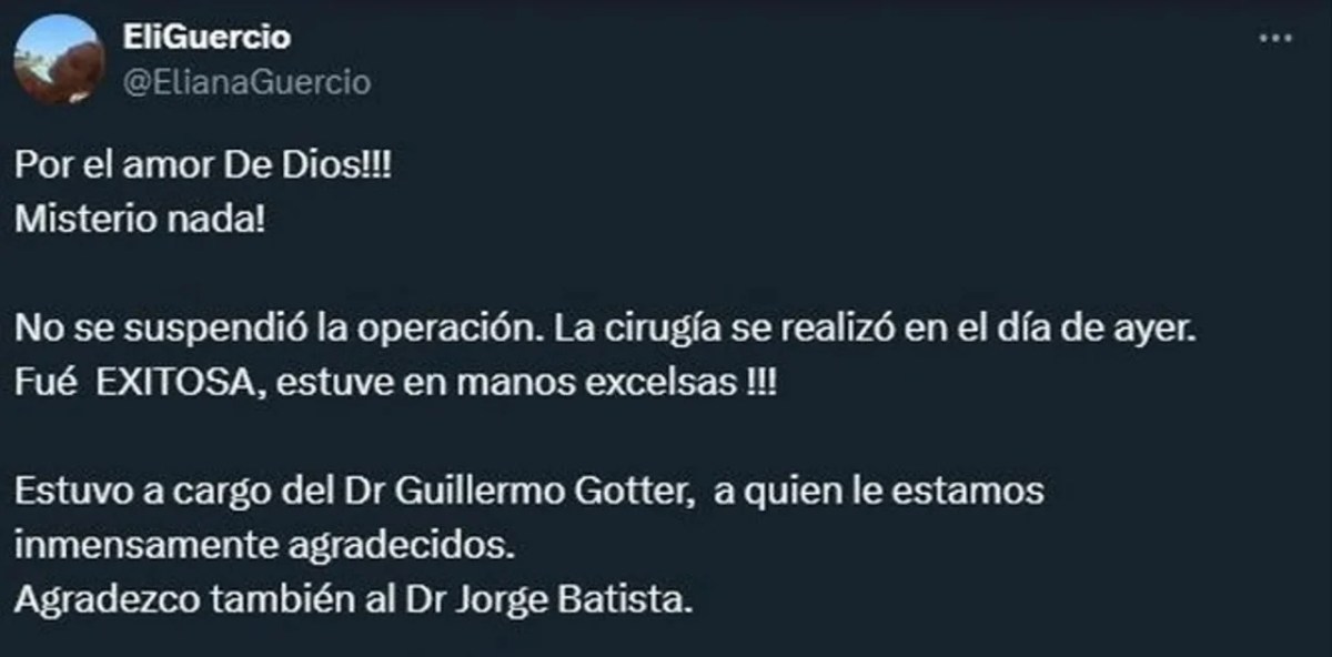 «Por el amor de Dios. Misterio nada. No se suspendió la operación. La cirugía se realizó en el día de ayer (lunes 1 de mayo). Fue exitosa, estuve en manos excelsas. Estuvo a cargo del Dr. Guillermo Gotter, a quien le estamos inmensamente agradecidos. Agradezco también al Dr. Jorge Batista», manifestó días atrás desde sus redes sociales.