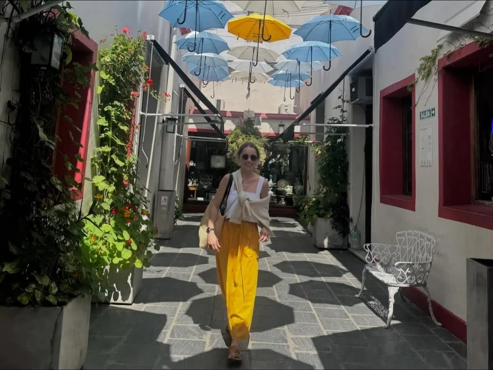 En días más calurosos se adueñó de un clásico paseo turístico en el ojo porteño, Emilia se lució con un pantalón amarillo que contrastó con los paraguas de la Galería Solar de French