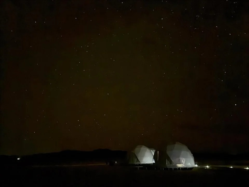 Al anochecer, la imagen que deslumbró sus retinas provino del campamento de lujo Pristine Luxury Camp, también en Salinas Grandes, lugar que se caracteriza por sus domos geodésicos.