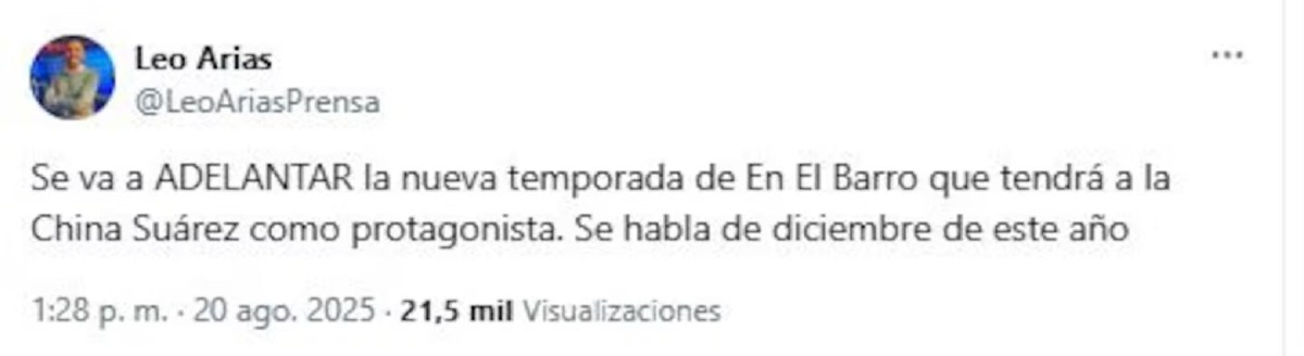Sin embargo, este miércoles, el periodista Leo Arias confirmó que el éxito de la serie modificó los planes iniciales. Así lo comunicó en X: «Se va a adelantar la nueva temporada de En El Barro que tendrá a la China Suárez como protagonista. Se habla de diciembre de este año«.