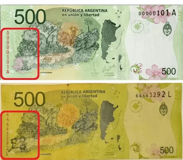 Una serie de billetes de $500 con el diseño del yaguareté llamó la atención de los coleccionistas. Estos ejemplares tienen un error en el marco inferior izquierdo, al costado del yaguareté bebe: se trata de una flor con tres hojas que no corresponde al diseño original.