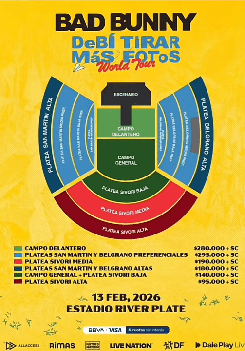 De acuerdo a los detalles que se compartieron, la productora argentina Dale Play, que anteriormente se había encargado del show del artista puertorriqueño en 2023, fue la encargada de anunciar que la preventa exclusiva comience el próximo lunes 12 de mayo a las 13 horas. Indicaron que será solo para clientes del banco BBVA.