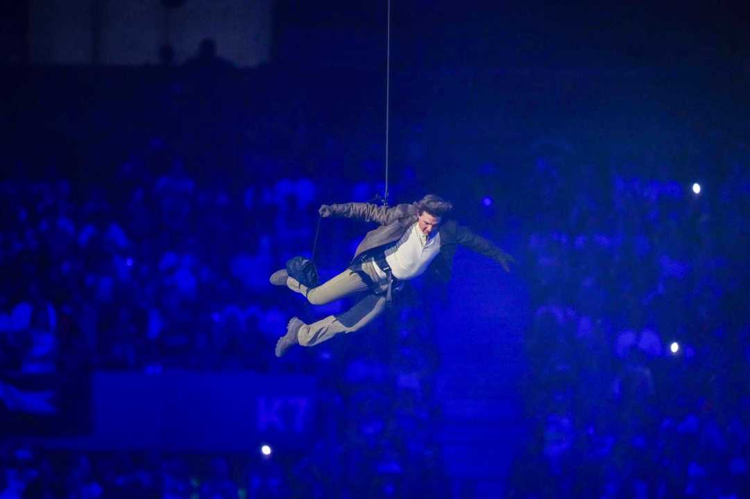 Una luz iluminó entonces una figura en el techo del Estadio de Francia y desde ahí se descolgó Tom Cruise como en una de sus películas de «Misión Imposible».